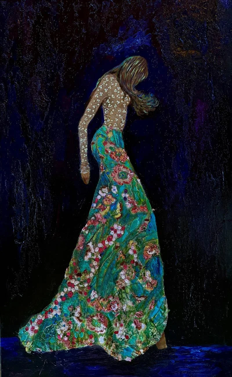 Mixed Media Acrylic 3-D embellished with crystals and lace. A beautiful woman walks gracefully in the rain, her colorful skirt flowing like a rainbow. Each step carries feelings - love, beautiful memories, and positive energy. The rain become part of her journey, reflecting her strength, hope, and the beauty of life's emotions.
